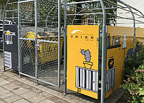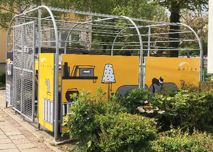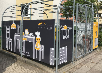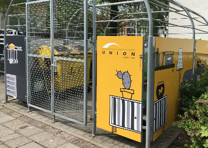 In der Arminiusstraße 10-14 ist seit Juni der Müllplatz samt seinen unschönen Mülltonnen zumindest optisch verschwunden. Grund dafür ist die verkleidete Mülleinhausung. Die Bilder in dezenten Gelb- und Grautönen greifen den bereits in der Fahrzeugflotte der UNION verwendeten Comicstil auf und sorgen so für Wiedererkennung der Genossenschaft.